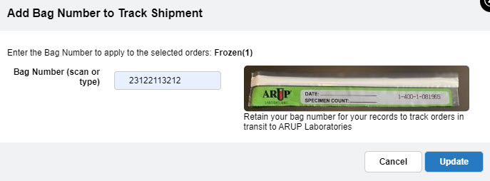 Add ARUP specimen bag numbers to orders for easy shipment tracking in Order Status and Results. To add specimen bag numbers to orders you have entered, select the Packing List tab.