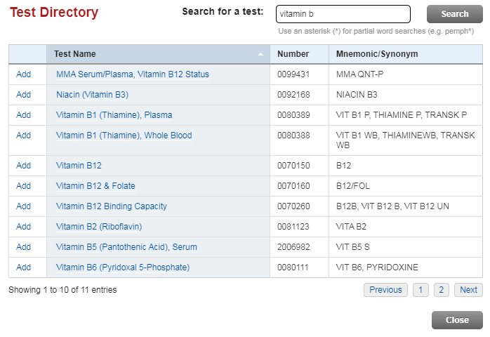 If you do not know the test number, enter the first few characters from a test name, mnemonic, or test number, and select Search or press Enter.