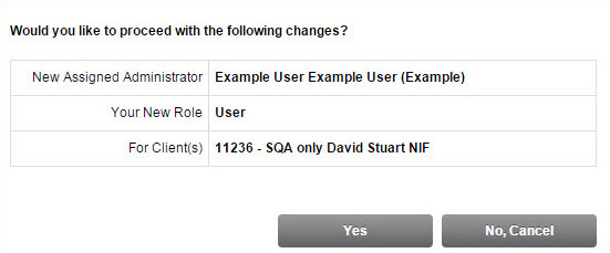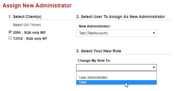 From the Change My Role To drop-down, select your own new authorization level for the selected client ID(s): User Administrator or User.