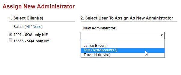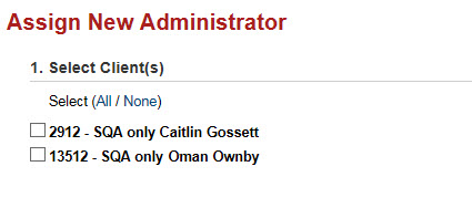 - In the Select Client(s) section, select the check box for each client ID you want to assign to a new administrator.