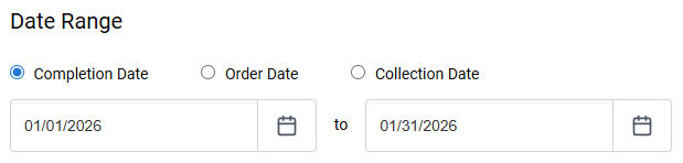 - For Date Range, select a date option and then a range of dates for that option. For example, if you select Completion Date and 01/01/2026 - 01/31/2026 for the range, the results will show all clinical trials tests that had a completion date in January 2026.