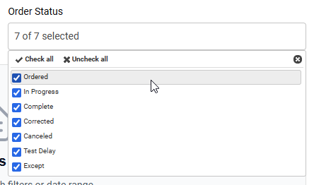 - To filter the results by order status, select or clear checkboxes in the Order Status drop-down menu.