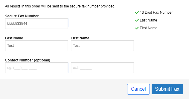 - In the Contact Number fields, enter your phone number so Client Services can contact you if more information is needed. These fields are optional; your phone number is not required to fax test results.
