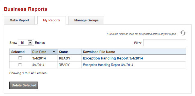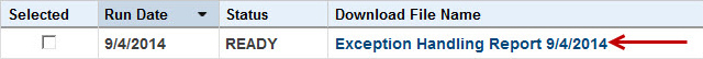 to refresh the page. If the status remains pending, wait a few minutes and try the refresh again. Data updates occur every few minutes. - Filter - In the Filter field, enter all or part of a run date, status, or file name to filter the list of reports.