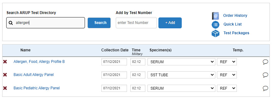 The test(s) are added to the order and the Specimen Collection fields are displayed.Note: Quick lists are set up under the Settings tab. See quick lists for more information.