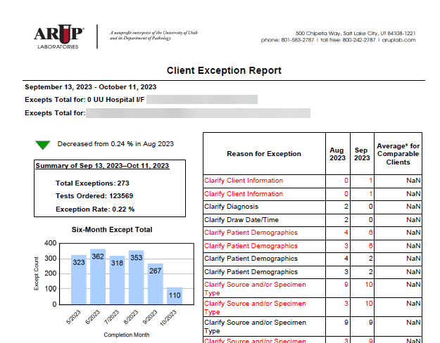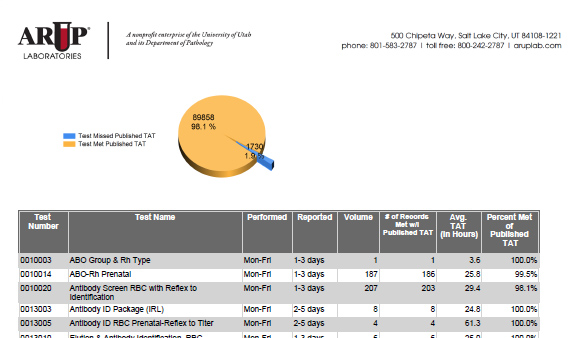 - Total percent summary of tests ordered that met the published ARUP turnaround time.