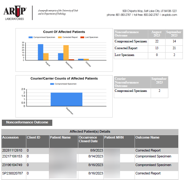 This reports documents reported occurrences and includes patient information, processes involved, and ARUP's responses to the following: