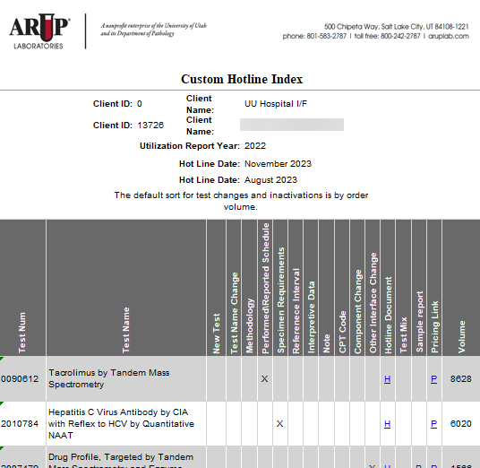 The Custom Hotline Index report provides a comparison between your utilization history (last 12 or 24 months) and the tests included in the quarterly Hotline. The information may be used as a tool to determine which tests ordered by your facility will have updates in the quarterly Hotline.