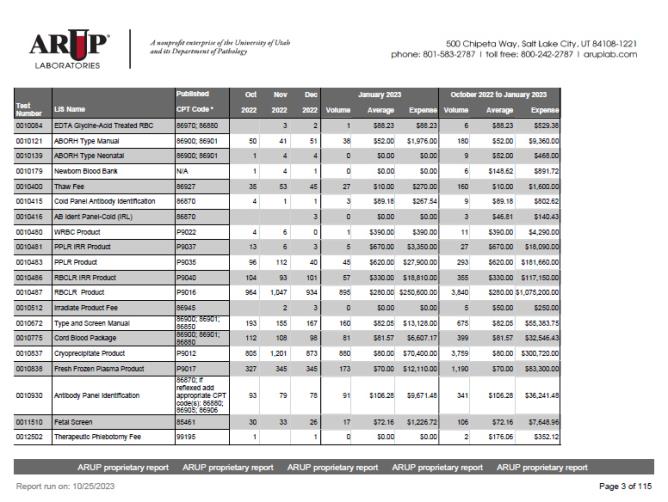 - Test number, name and published ARUP turnaround time for each test ordered.