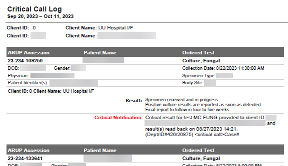 The ARUP Critical Call Log Report provides information about all critical calls (up to three years of data is available).