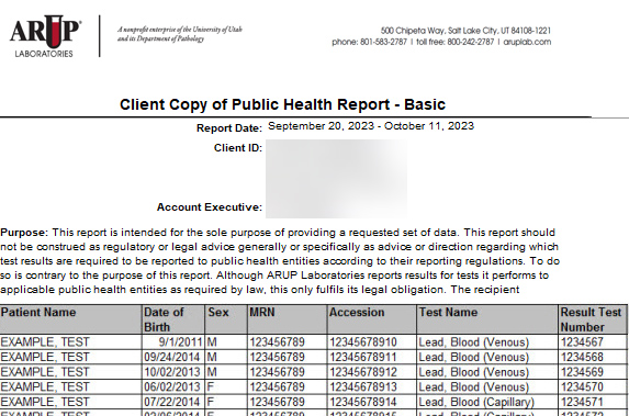 - ARUP Accession Number, Patient Name, and the Ordered Test.