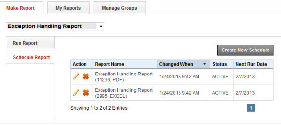 When you select the Schedule Report tab, you will see existing reports you have created.