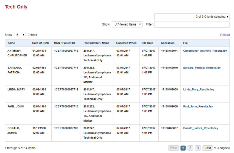 With the Tech Only application, pathologists can view and download technical data files sent from the ARUP Flow Cytometry department. When data files have been viewed, they move to Viewed Items. Files older than 12 months are removed.
