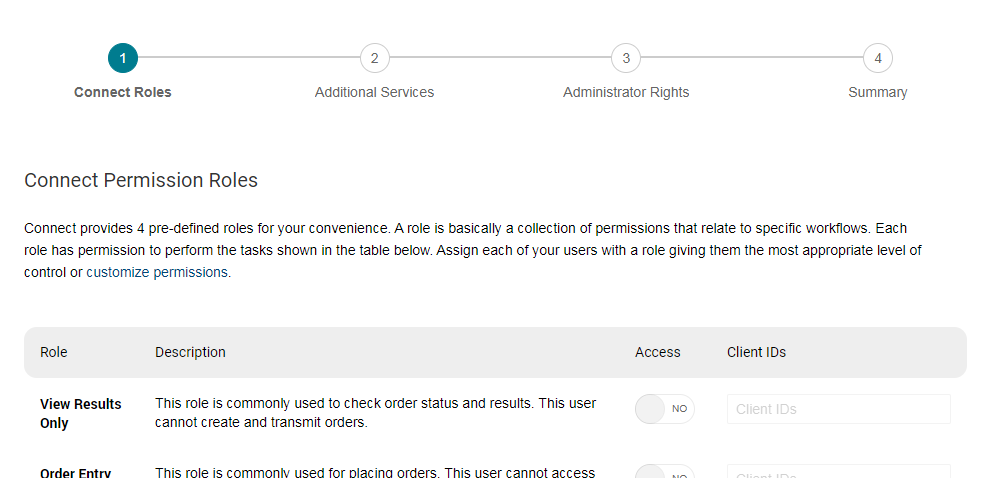 The Connect Permission Roles page appears. You will set up the user's permission role, additional services, and administrator rights starting here.